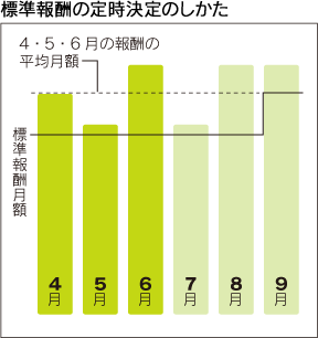 毎年4・5・6月の給料の平均額をもとに決める方法で、標準報酬月額の「定時決定」といいます。9月から翌年の8月までの1年間は、定時決定された標準報酬月額が毎月の保険料の計算などに使われます。