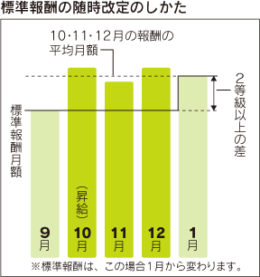 9月から翌年8月までに、昇給や降給などで給料の「固定的賃金」が変わり、引き続いた3ヵ月間の報酬月額の平均をあてはめた標準報酬月額の等級が、前の等級に比べて2等級以上変わるときには、臨時に改定を行います。これを標準報酬月額の「随時改定」といい、残業代が多くなったなど、「非固定的賃金」だけで報酬月額に変動があった場合には、随時改定は行われません。 4ヵ月目から新しい標準報酬月額が使われますが、1月から6月までの間に随時改定があったときは、その年の8月までその標準報酬月額が使われ、9月からは定時決定で計算し直された標準報酬月額が使われます。7月から12月までの間に随時改定があったときは、翌年の8月までその標準報酬月額が使われます。 このほか、実際の報酬に応じた保険料負担となるようにする育児休業等終了時改定があります。