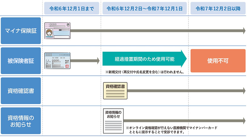 すでに交付されている被保険者証については、経過措置として令和7年12月1日まで使用することができます。令和7年12月2日以降は使用することができません。 経過措置の期間中に資格を喪失した場合には、その時点で使用できなくなります。 ※被保険者証の新規交付(再交付や氏名変更を含む)は令和6年12月1日までです。以降は行うことができません。 ※被保険者証の有効期限が令和7年12月1日より前に切れる場合には、その有効期限以降は使用できません。 |